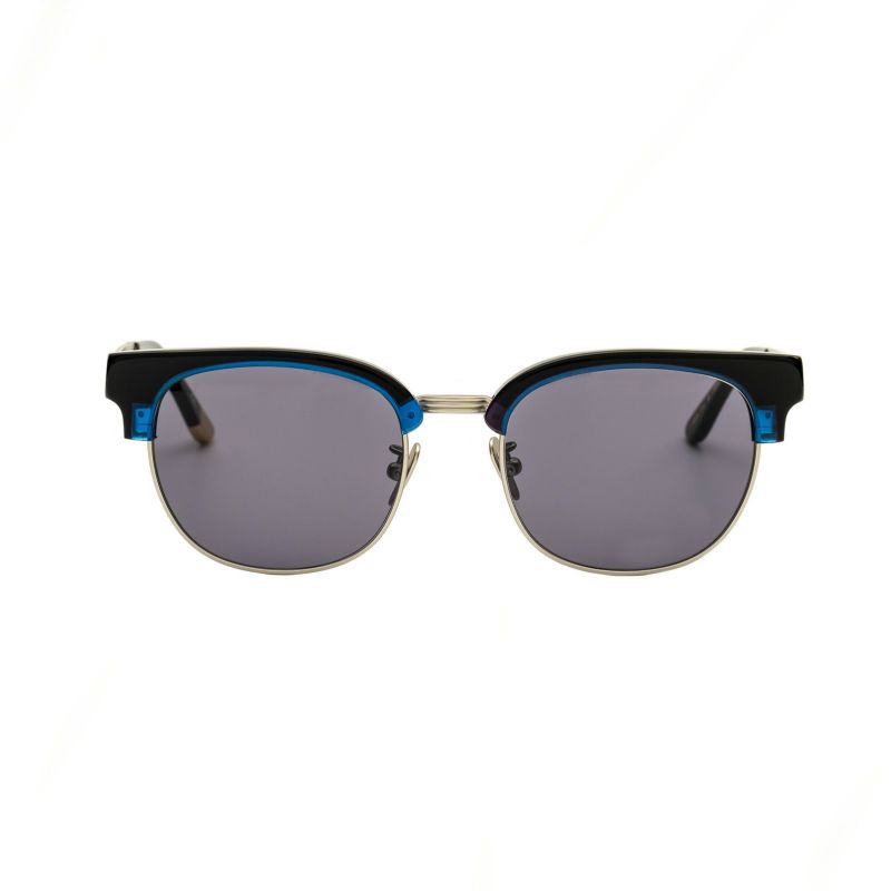 【骨太さとスマートさを兼ね備えたブロウタイプモデル】フロントは天地幅を若干抑え、緩くスクエア型のアウトラインになるように設計。最大の特徴は、幅広のメタルで構成されたフロントからアームにかけてのシルエット。フィニッシュに向かい細身になるようにデザインされ、スマートな印象を残すことで全体のバランスを取っています。